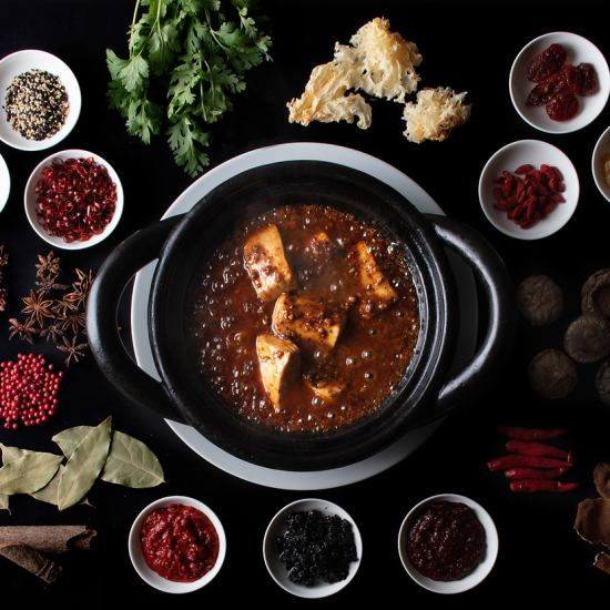 目指したのは辛さの極み!大きめにカットした豆腐をグツグツと煮えたぎる熱々の土鍋でご提供する麻婆豆腐。ほぼ全てのコースでお楽しみいただける、自信を持ってお勧めするお料理です。(S 1,250円/M 1,800円)